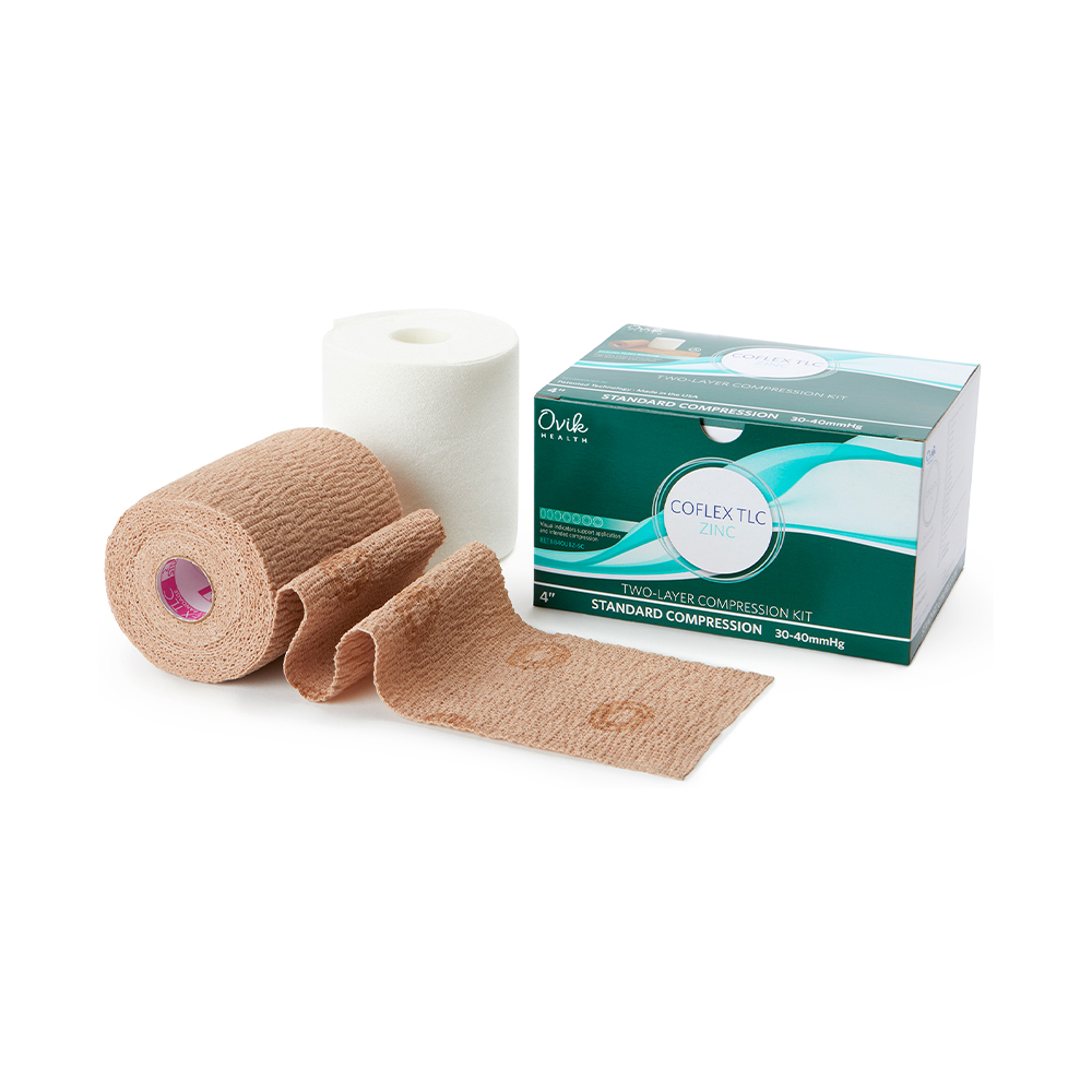 Providing guidance for this zinc compression bandage are visual indicators during application. CoFlex® TLC Zinc Standard offers 30 to 40 mmHg (for patients with an ABI ≥ 0.8) of compression.